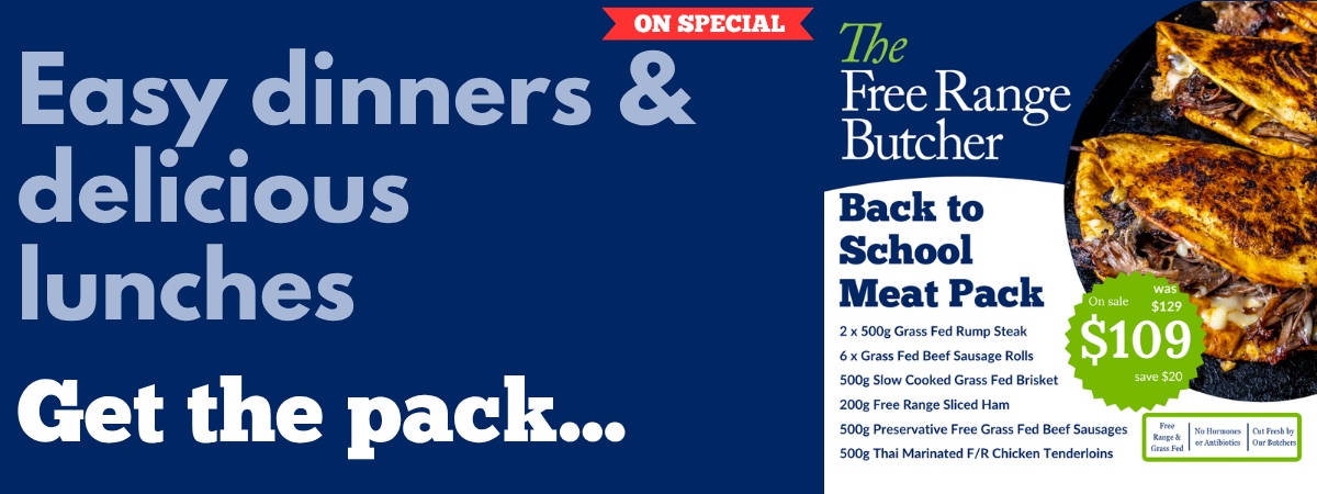 Our 'Back to School Meat Pack' makes for easy lunches and dinners 2 x 500g Grass Fed Rump Steak 1 x 500g Preservative Free Thin Beef Sausages 2 x 600g Beef Sausage Rolls