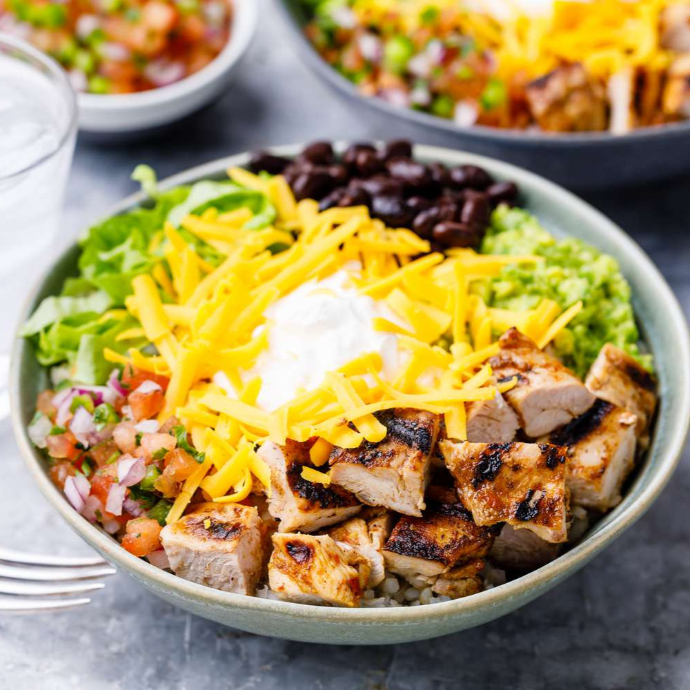 Use the cooked chicken to create Chicken Burrito Bowls with rice, corn, black beans, capsicum and cherry tomatoes. Top with your favourite dressing.
